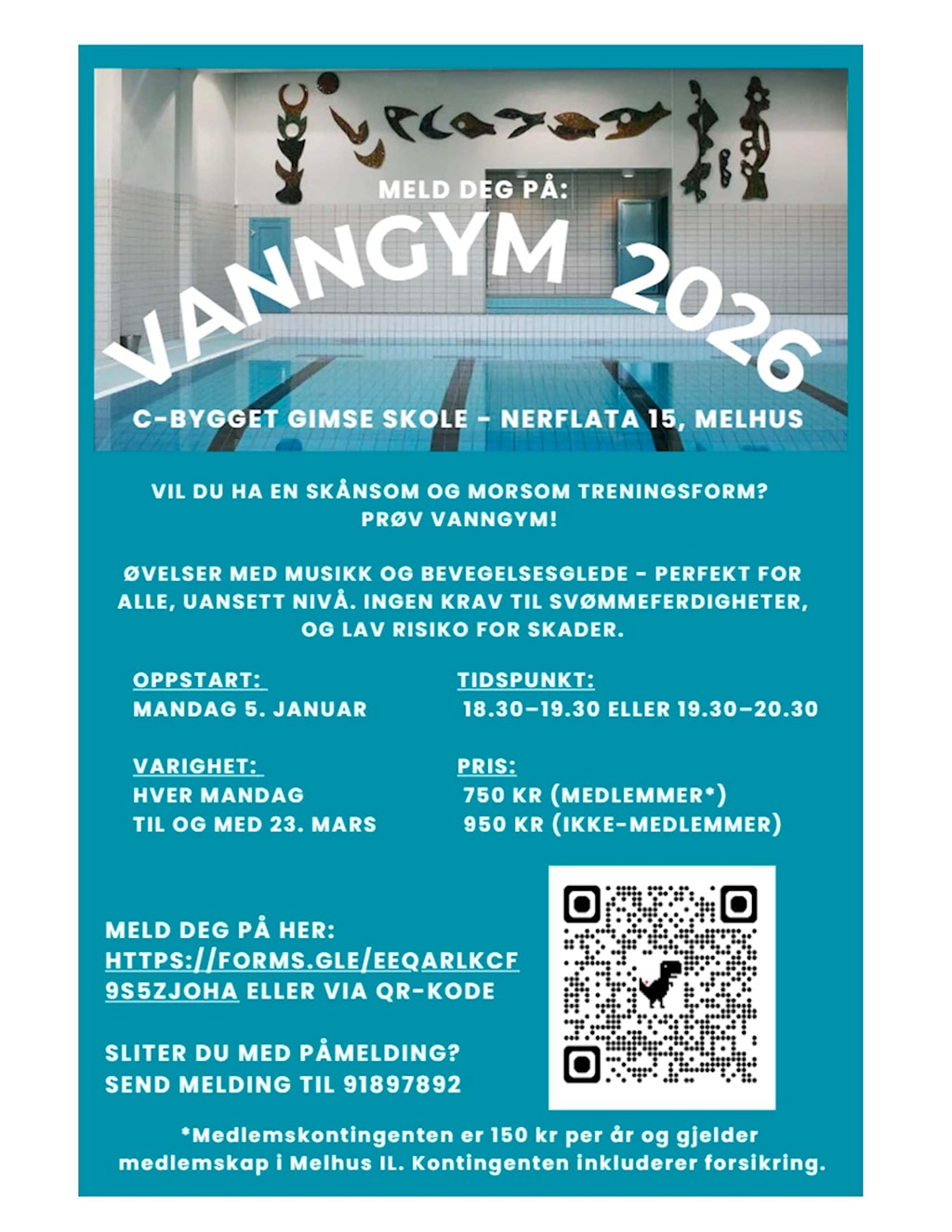 Vanngym er en morsom, skånsom og effektiv treningsform som passer for alle – uavhengig av svømmeferdigheter, alder, vekt eller fysisk form. Øktene foregår i varmt vann (27 °C) i C-bygget på Gimse skole, hvor vannets naturlige oppdrift og motstand gjør øvelsene lettere å gjennomføre og reduserer belastningen på ledd og muskler. Dette gjør vanngym til et godt alternativ både for nybegynnere og for dem som driver med annen idrett.